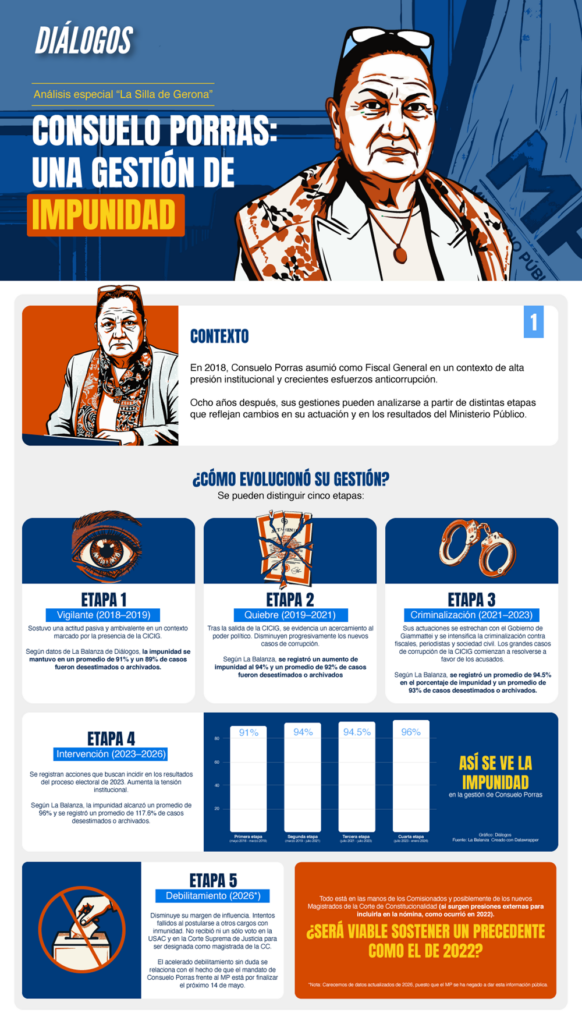 Finalmente, la quinta y última etapa identificada (enero 2026-actualidad) da cuenta de un debilitamiento progresivo en cuanto a los alcances y el margen de poder e influencia del MP de Consuelo Porras. En este año no se han iniciado nuevos casos o nuevos procesos bajo la lógica de la persecución penal sistemática que se venía sosteniendo en los años anteriores. Incluso, ha habido operativos que han tenido efectos adversos, como los allanamientos a los centros de votación del CANG en la segunda vuelta para la elección de Magistrado Titular y Suplente de la Corte de Constitucionalidad. A pesar de las acciones del MP, la elección registró niveles de participación importantes, y resultó ganadora la candidata Astrid Lemus con más del 53% de los votos.