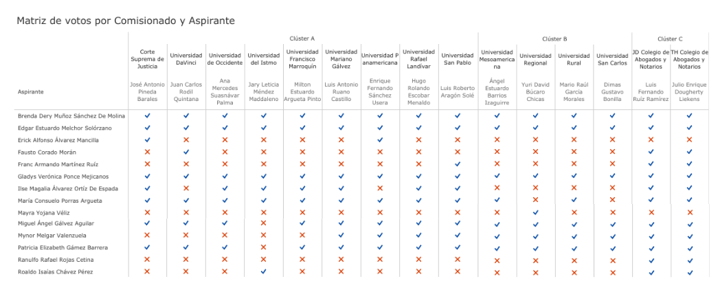 En la Comisión de Postulación de 2018 predominó el consenso en la votación para la integración de la nómina de 6 que se le envió al Presidente Jimmy Morales. Sin embargo, en el caso de otros aspirantes que no pasaron a la nómina, sí se registraron votos aislados. Por ejemplo, quien menos votos obtuvo fue la profesional Mayra Véliz, que a pesar de tener 70 puntos de calificación, sólo obtuvo un voto a favor (el del Decano de la Universidad Regional). Véliz fue la Secretaria General y mano derecha de Thelma Aldana durante el período que estaba concluyendo como Fiscal General. Además de Véliz, hubo otros aspirantes con sólo 2 o 3 votos a favor.