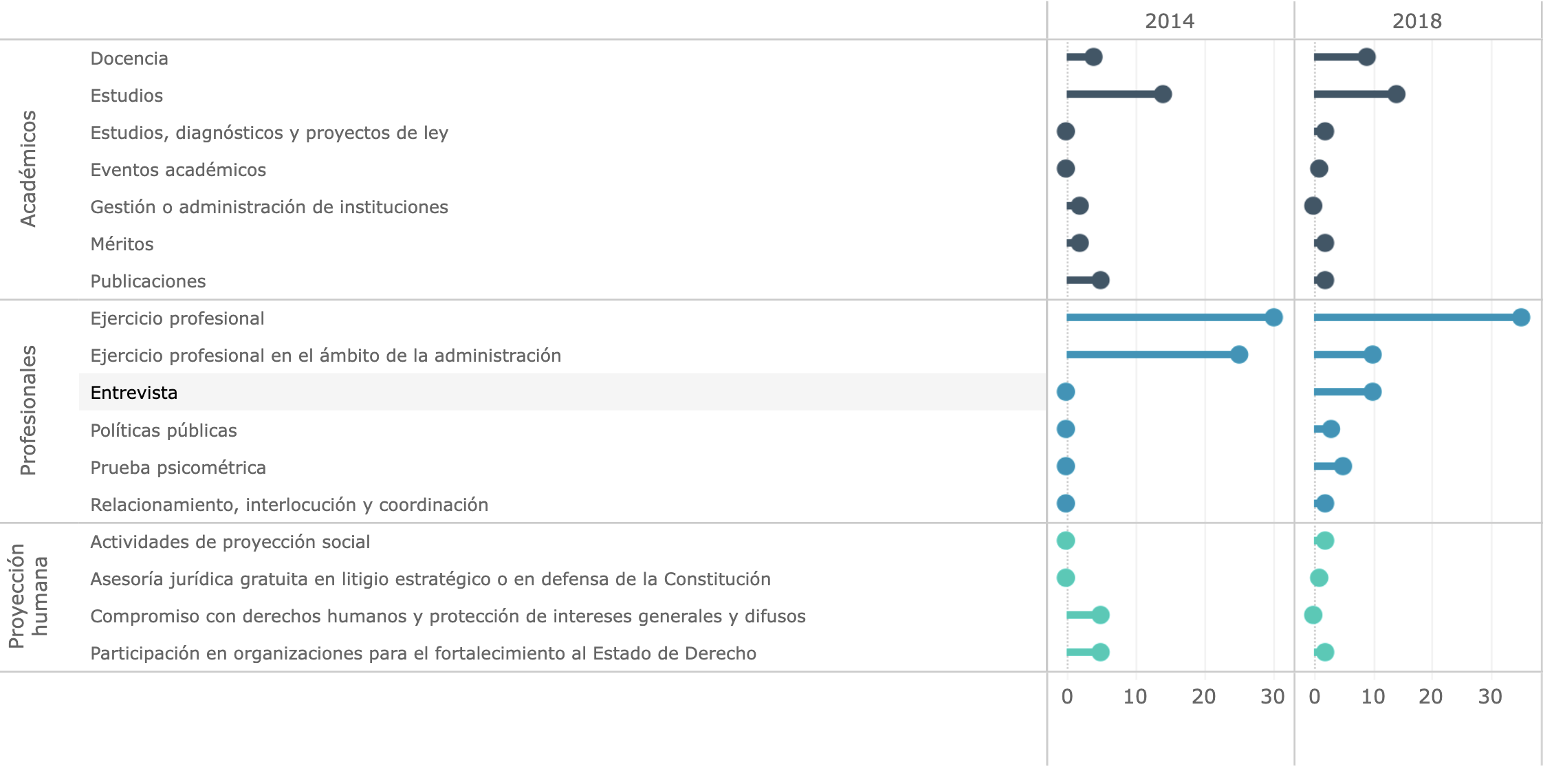 En general, en este proceso hubo una mejora respecto a las calificaciones obtenidas en la designación de 2014. En el año 2014 el promedio de calificación fue de 36 puntos, y en 2018 de 53.9 puntos. Esto puede deberse a ajustes técnicos en la distribución de los punteos de la tabla de gradación. Y, aunque la cuestión de que la forma prima sobre el fondo se mantuvo en esencia, en 2018 se distribuyeron relativamente mejor las notas (sobre todo en los aspectos profesionales) y también se valoraron aspectos más específicos respecto a 2014.