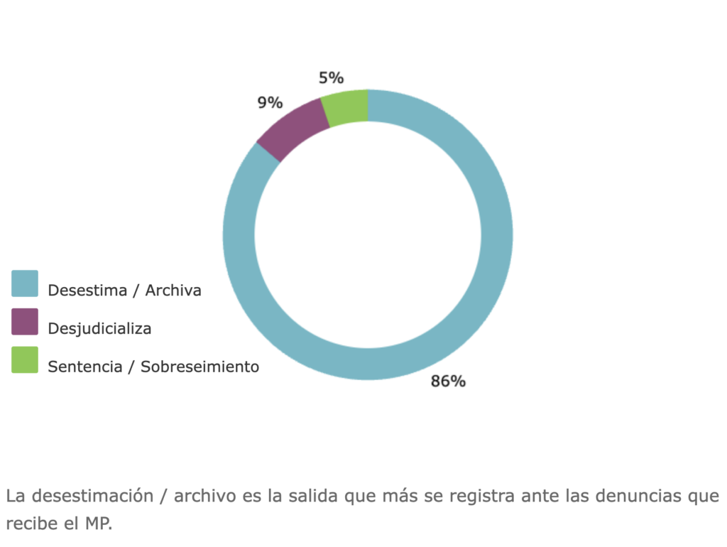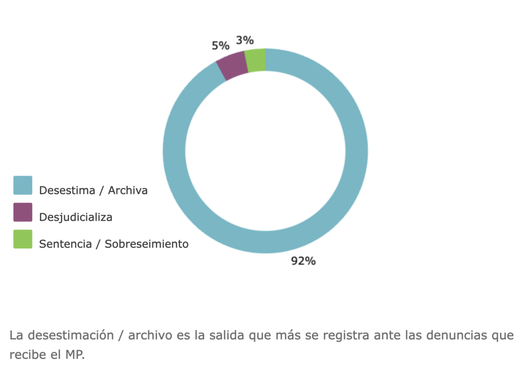 También en este primer período de Consuelo Porras se ve un desgaste generalizado del MP. El promedio de impunidad subió 1% respecto a la gestión de Thelma Aldana (pasando de un promedio de 92% a un promedio de 93% nuevamente, lo que equivale a un estimado de 50 mil casos más en impunidad). Asimismo, la desestimación de casos pasó de registrar un promedio de 86% (en la gestión de Aldana) a registrar un promedio de 91% (en esta primera gestión de Porras). Esto último equivale a un estimado de 350 mil denuncias más que fueron desestimadas en la primera gestión de Porras respecto a la gestión de Aldana.